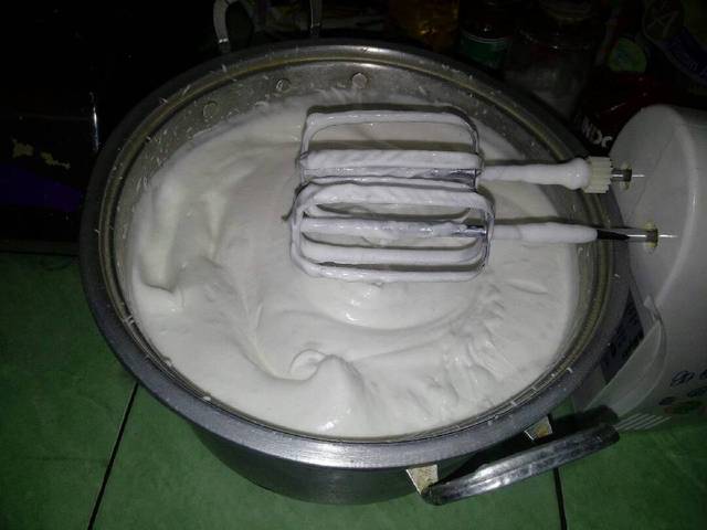 - Setelah eskrim beku, keluarkan dan mixer lagi hingga lembut dan mengembang.